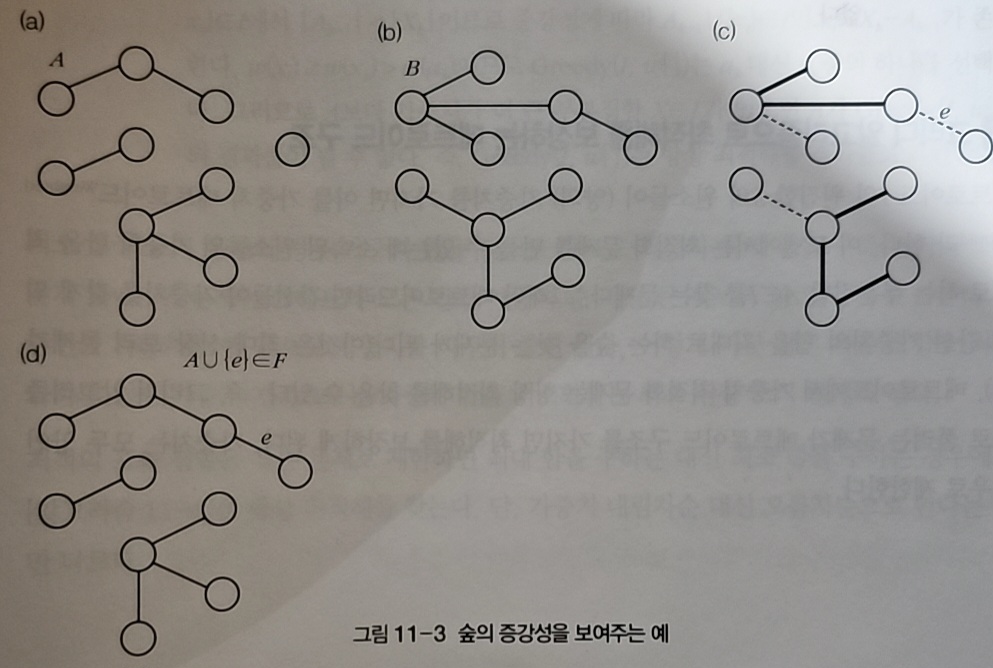 두 숲 A와 B가 있고 B의 간선이 더 많다면, B의 어떤 간선을 A에 추가해도 여전히 숲이다.