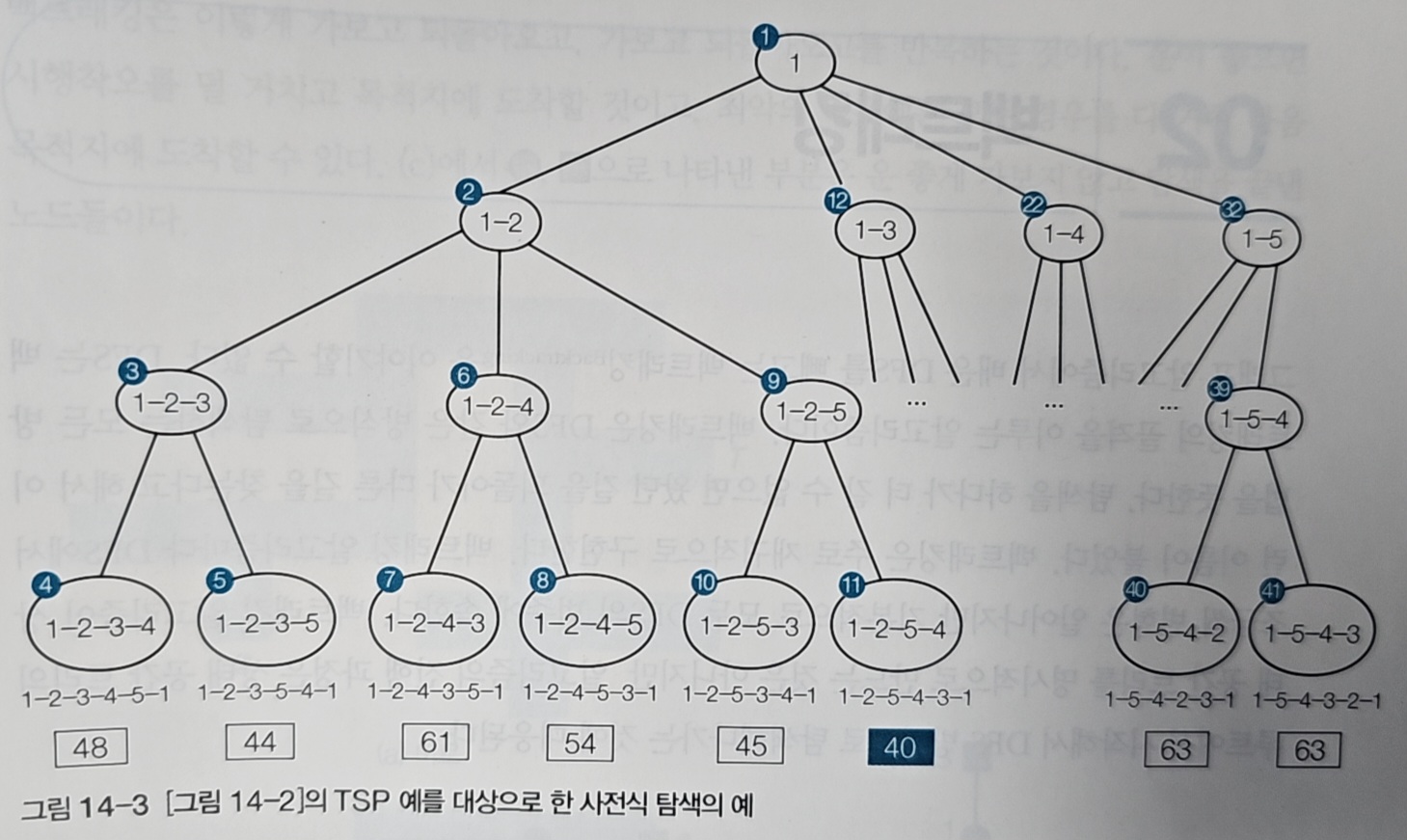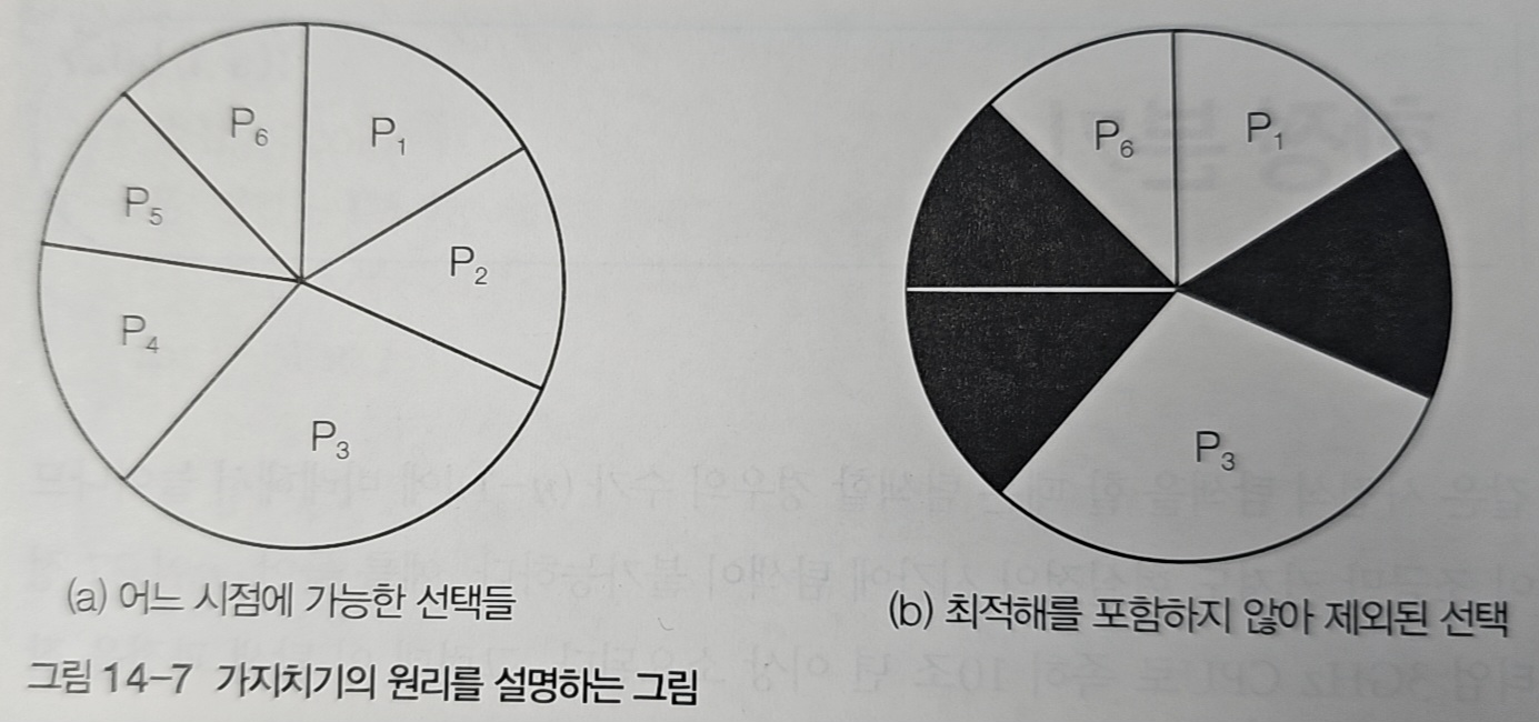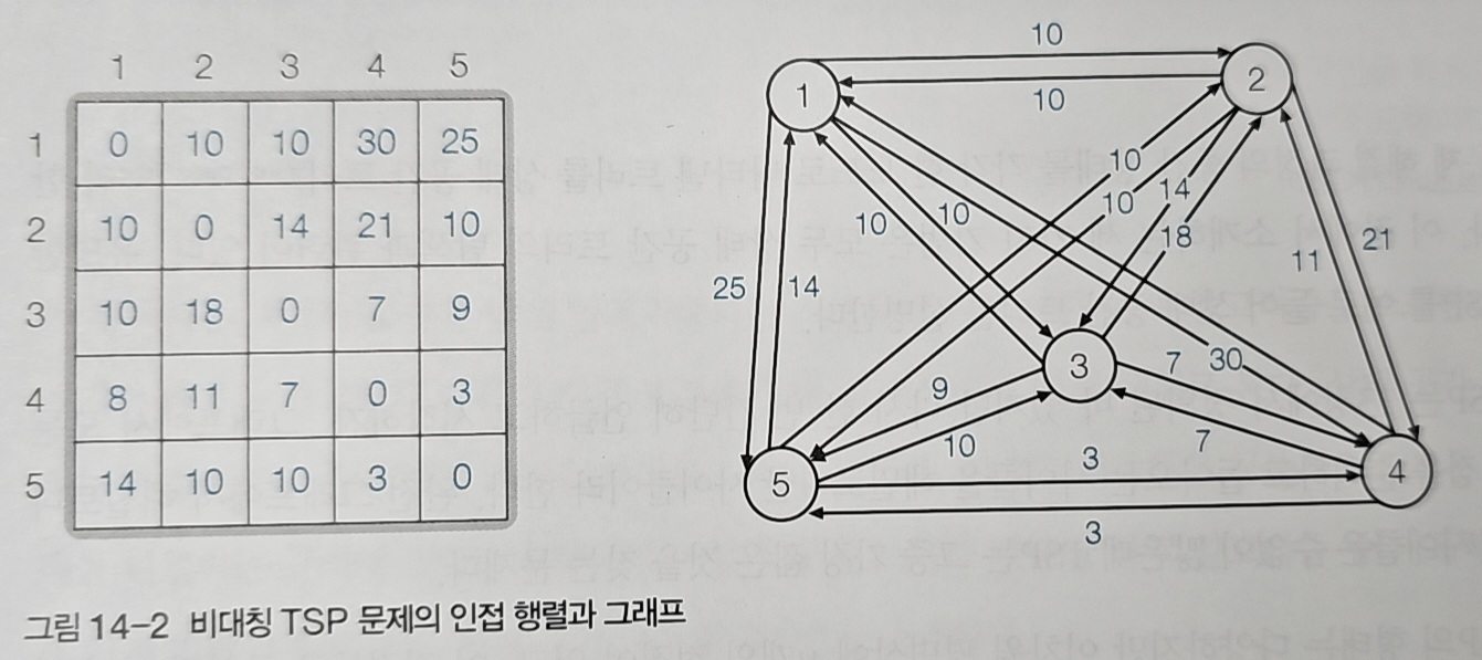 그림 14-1은 외판원 순회 문제(TSP)를 보여준다. TSP는 n개의 도시를 각각 한 번씩 방문하고 출발 도시로 돌아오는 경로 중, 총 이동 거리가 최소인 경로를 찾는 문제다.